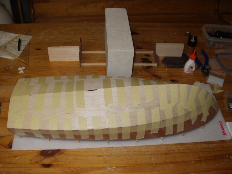 Im nächsten Schritt beginnen wir dann bereits mit der Beplankung des Rumpfes. Als erstes werden die beiden Seitenplanken nacheinander mit dem Spantgerüst verleimt und mit Klammern und Klebestreifen bis zum Trocknen gesichert.