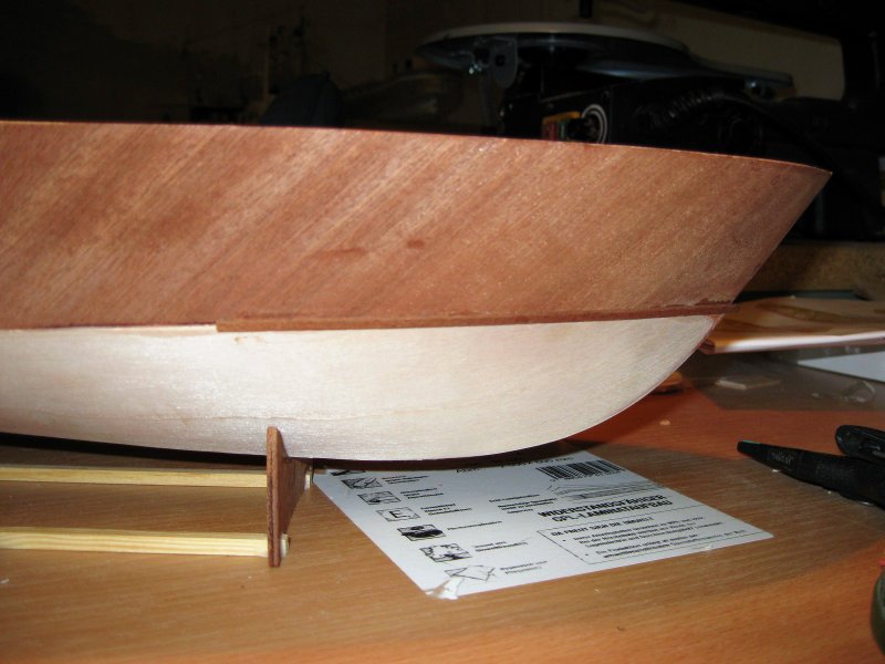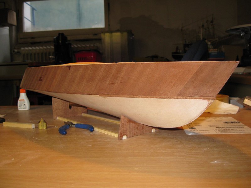 Im Bugbereich wird genau am Knick zwischen Boden und Seitenwand beidseitig je eine 170mm lange Leiste angeleimt. Diese dient als Abweiser für die Bugwelle, damit das Vordeck trocken bleibt. Ohne diese Leiste spritzt ständig ungehindert Wasser vorn auf das Boot.