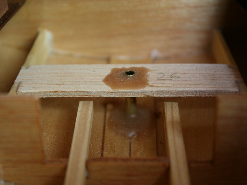 Zum Schluss wird noch der Ruderkoker montiert: ein vorgefertigtes Brett wird als oberes Lager in 2 Aussparungen im Heck geklebt und durch die vorhandenen Bohrungen hier und im Rumpfboden wird ein Messingrohr gesteckt und sorgfältig verklebt. Dieses Rohr muss wieder absolut dicht eingebaut werden, da sonst später Wasser eindringen kann.
