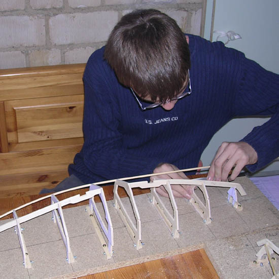 Danach wird aus 1mm Sperrholz der Heckspiegel ausgeschnitten und hinten am Kiel befestigt. Zum Abschluss wurden dann noch auf die gleiche Weise die Stringer in die Ausschnitte eingepasst und verleimt. Als letztes noch die Stringer beischleifen, so dass eine plane Oberfläche entsteht.