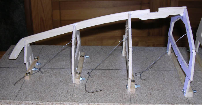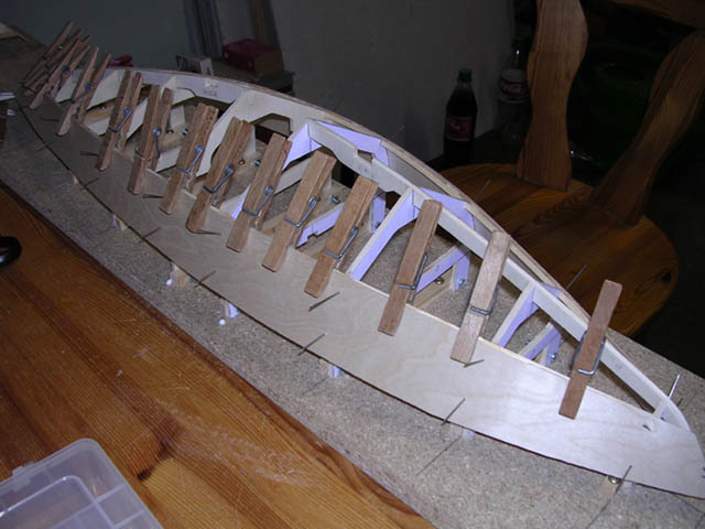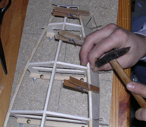 Dann werden alle Spanten und die Oberseite der Stringer gut mit Leim eingestrichen. Jetzt sollte die Planke möglichst schnell am Vorsteven angesetzt und mit einer Klammer befestigt werden. Mit weiteren Klammern befestigt man das Holz am Stringer. Zuletzt wird die Planke mit Leistennadeln (0,9x30mm) auf die Spanten geheftet, damit sie flächig anliegt. Wichtig ist dabei, dass die Nadeln schräg eingeschlagen werden, damit das Holz nicht an ihnen hoch rutscht. Nun heißt es: gut trocknen lassen, da die Holzspannung doch recht hoch ist.