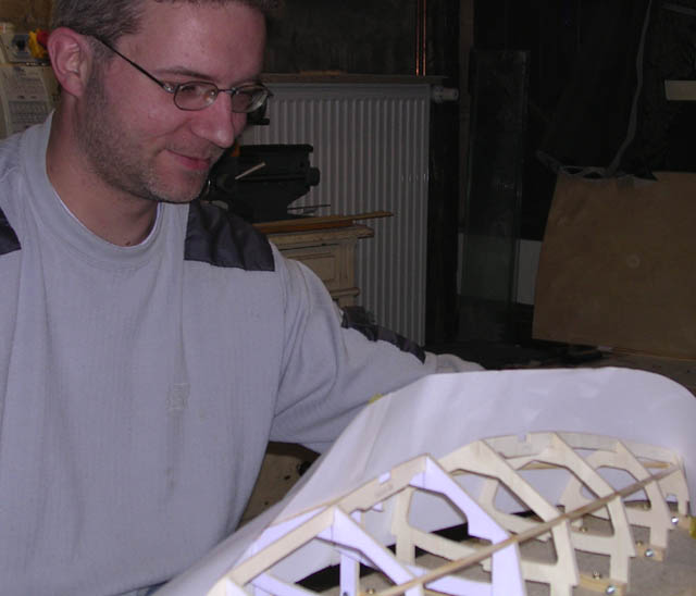 Heute haben wir mit der Beplankung begonnen. Zuerst haben wir mit einem Blatt eine grobe Abwicklung der oberen (decksseitigen) Planken hergestellt und diese Form dann aus 1mm-Flugzeugsperrholz ausgeschnitten. Die hieraus entstandene Planke wird in der Länge, also an Vorsteven und Heckspiegel, auf den Rumpf zugeschnitten. In der Höhe reicht ein grober Zuschnitt, da hier hinterher beigeschliffen wird.