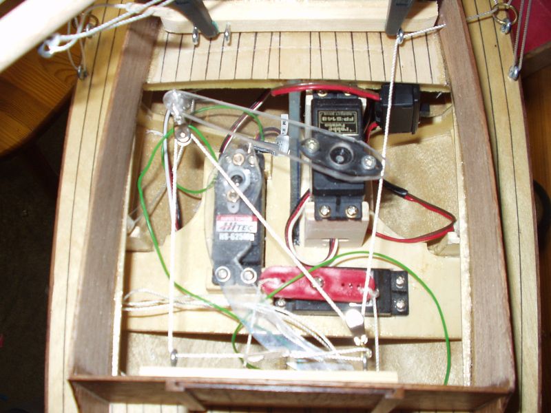 Wenn man als Segelservo vorher ein Standard-Servo verwendet hat, sollte man dieses jetzt gegen ein stärkeres in Standardgröße austauschen, da das Gaffelsegel mehr Fläche hat. Das frei gewordene Servo kann dann die Steuerung der Vorsegel übernehmen.