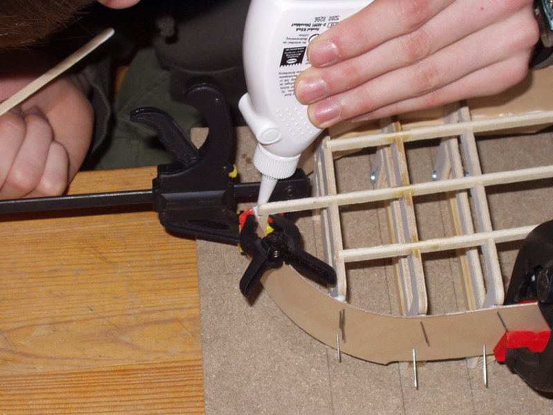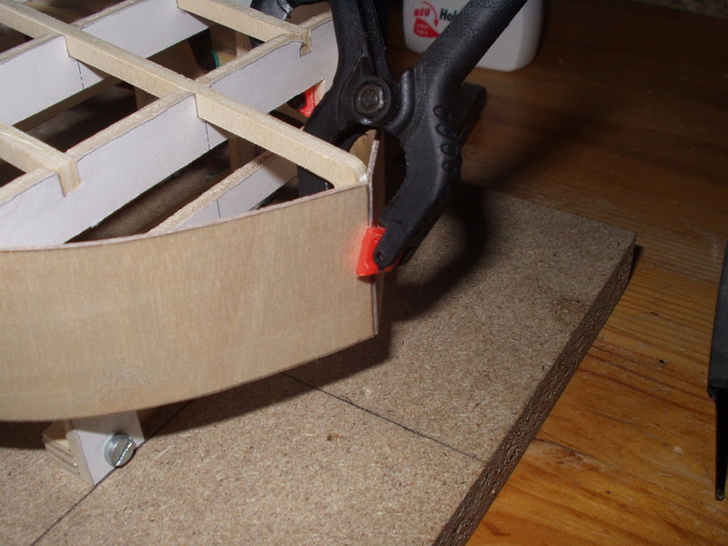 Die erste Möglichkeit ist das Fixieren mittels Leistennadeln bis zur Trocknung. Hierbei wird die Planke "in einem Zug" angebracht und direkt alle Spanten und Stringer mit Leim eingestrichen. Die Leistennadeln (0,9x30mm o.ä.) werden dann in jedem Spant leicht schräg zueinander (damit die Planke nicht an ihnen hochrutschen kann) eingeschlagen.
