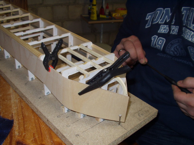 Bei beiden Versionen empfiehlt sich das zusätzliche Anbringen eines Stringers von 4x4mm zwischen Spant 11 und 12, da sich sonst durch die scharfe Biegung vor Spant 12 die Planke hier nach außen wölben würde. Wichtig ist, dass die Seitenplanke mit dem Stringer verklebt wird und mit einer Klammer gesichert wird beim Biegen.