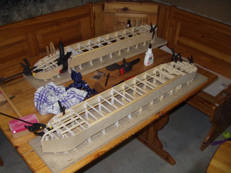 An Bug und Heck wird erst eine Seite angebracht und nach dem Trocknen passend abgelängt. Die zweite Seite wird dann überlappend verleimt und dann bündig an der ersten Planke abgeschnitten. Dadurch vermeidet man die Bildung von Spalten, die man später verspachteln muss und erreicht eine saubere Spitze.