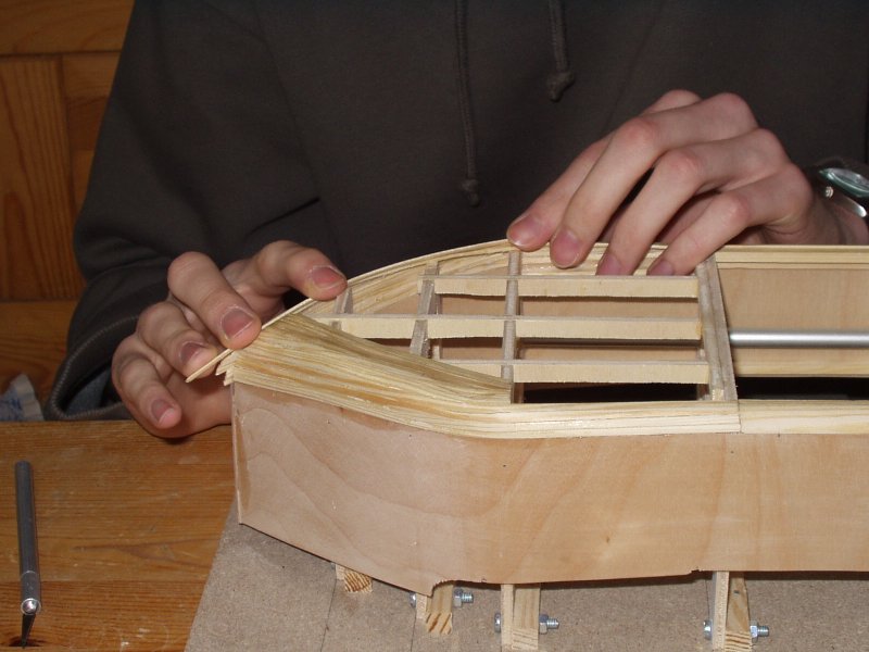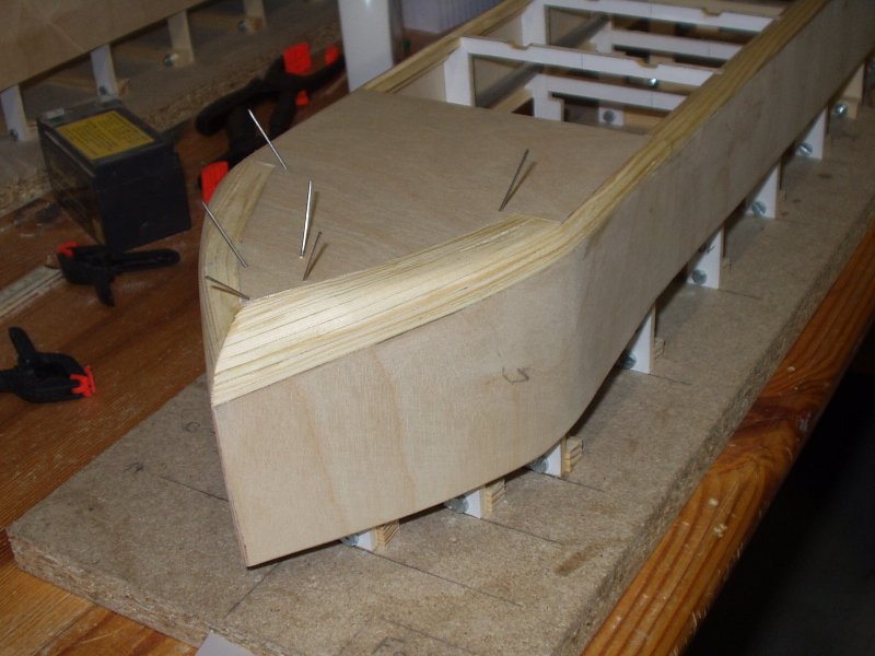 Als nächstes wird der in etwa dreieckige Zwischenraum am Bug und der dahinterliegende Bereich von Spant 12 bis 11 (also bis zum Viertelstab) mit einer Bodenplatte aus Flugzeugsperrholz mit 1mm Stärke versehen. Für diese wird mittels auf das Spantgerüst gelegtem Transparentpapier die Form ermittelt und ausgeschnitten. Nach den wahrscheinlich bei jedem notwendigen Schleifarbeiten zum sauberen Anpassen dieses Teils werden die Spanten mit Holzleim bestrichen und das Bodenteil aufgelegt und angedrückt. Im Bugbereich werden, vor allem wenn noch Rundung im Bug abgedeckt werden muss, einige Leistennadeln zum Fixieren eingeschlagen (schräg, damit die Bodenplatte nicht an den Nadeln hoch rutschen kann). Dieser Bauabschnitt erhält nun bis zur nächsten Woche Zeit zum Trocknen und wird dann sauber an den Kanten zu den Planken verschliffen...